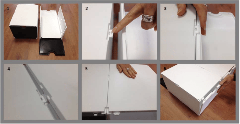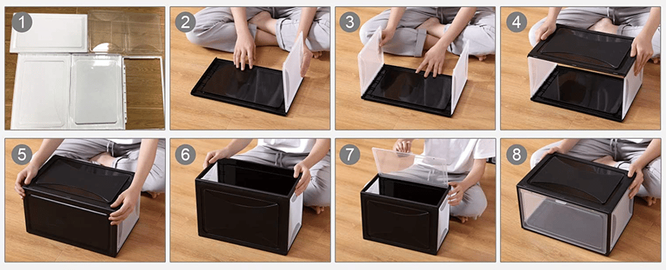 Die stapelbare Schuhbox lässt sich mit wenigen Handgriffen aufbauen und mit weiteren Boxen stabil verbinden.